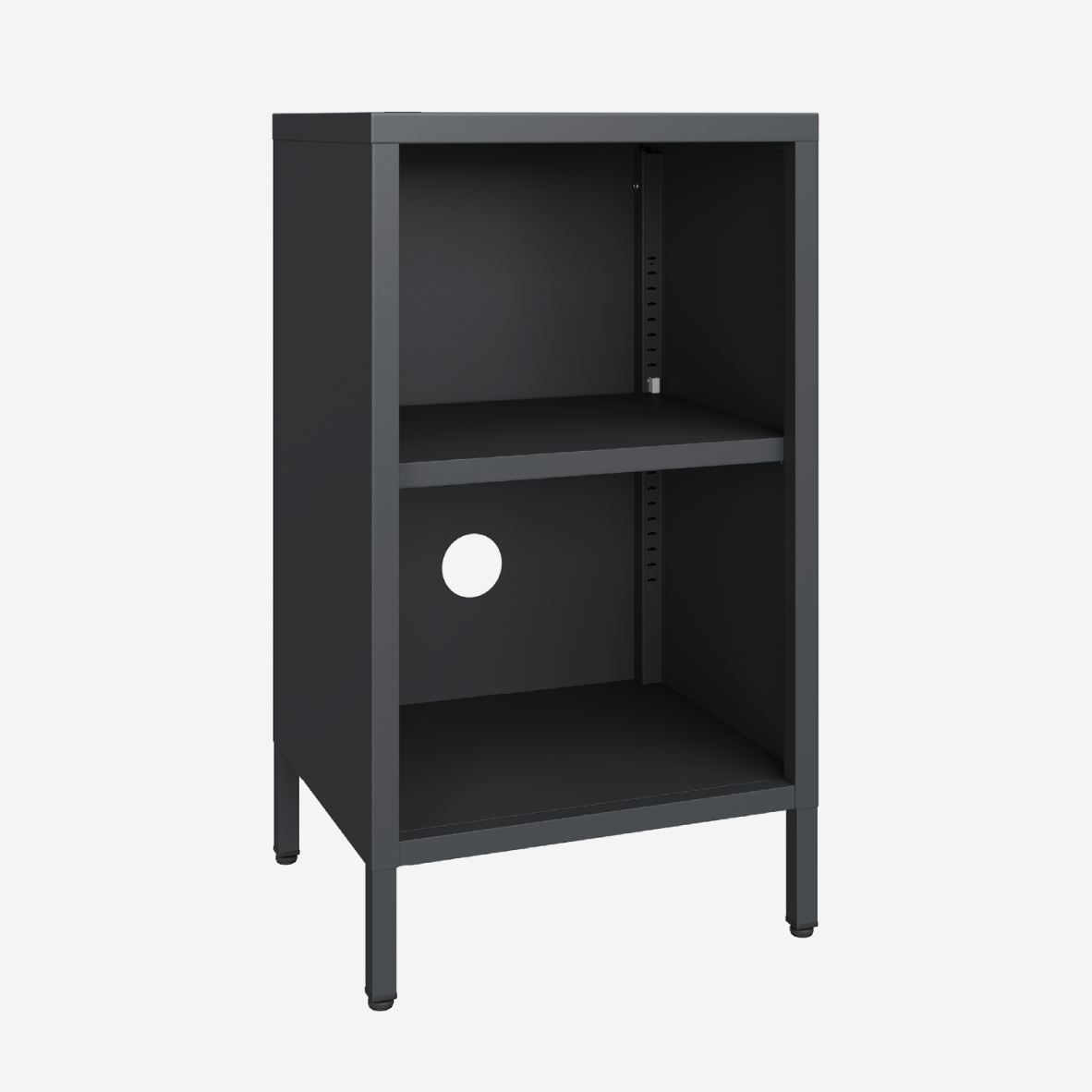 Conquer your home storage needs with the Wafer Side Table. No doors means no limits - easily access your belongings. Customise the shelving to fit your needs and keep cords organised with the built-in cable routing hole. The Wafer Side Table is constructed from durable powder coated steel and features integrated cable routing and adjustable shelving.